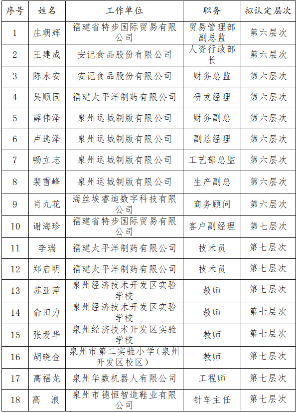 根据《泉州市人民政府办公室关于印发泉州市高层次人才认定和团队评审及政策支持规定的通知》(泉政办〔2021〕29号)及《中共泉州市委经济技术开发区工作委员会办公室 泉州经济技术开发区管理委员会办公室印发泉州开发区第六、第七层次人才认定标准的通知》(泉开委办〔2022〕28号)等有关规定,为广泛接受社会监督,现将庄朝辉等18人拟认定为泉州市第六、七层次人才名单予以公示;公示时间从2024年12月9日开始,公示期五个工作日。任何单位或个人对公示情况有异议的,均可在公示期内以来电、来信(邮)、来访的方式提出。