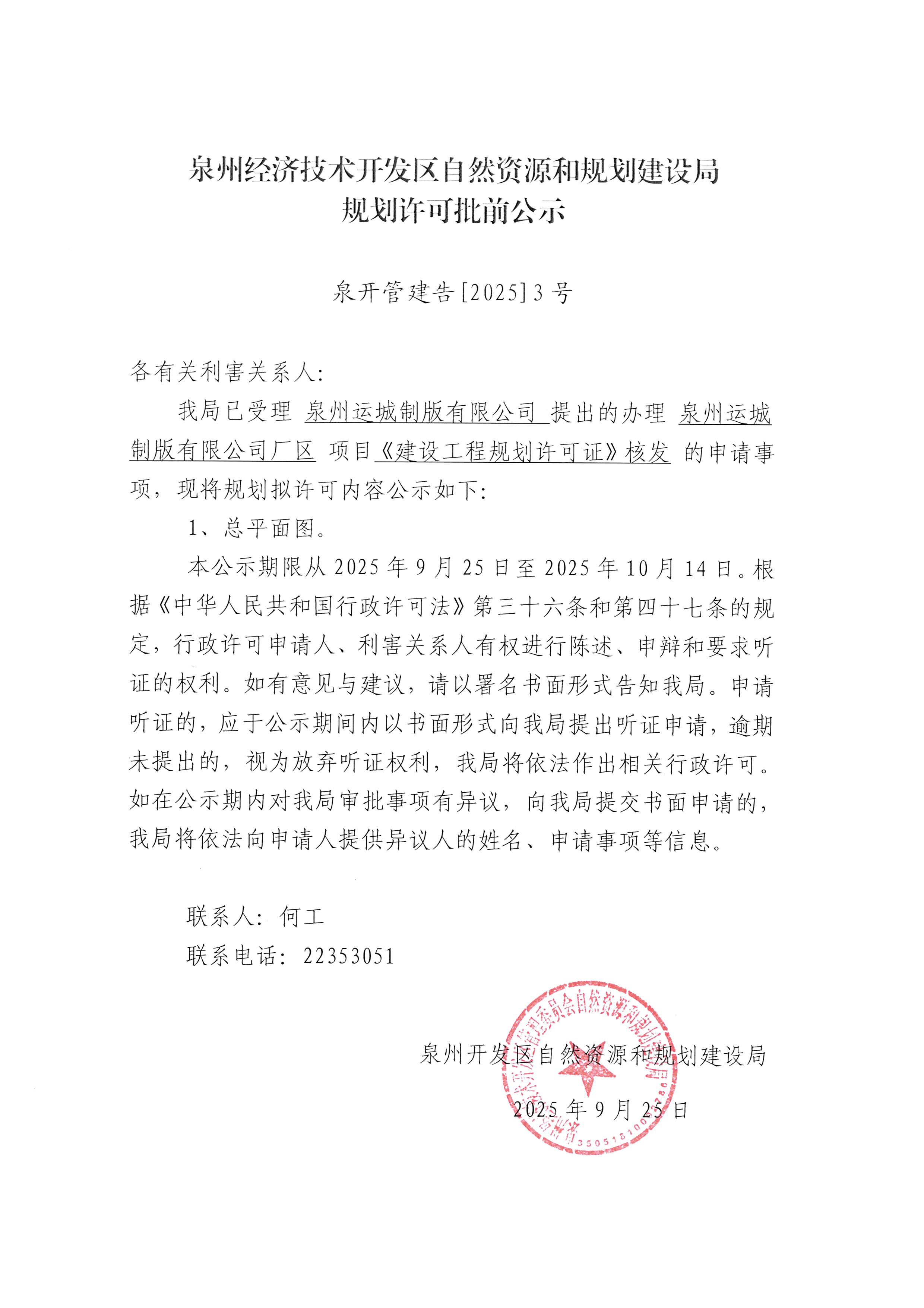 泉州经济技术开发区自然资源和规划建设局规划许可批前公示